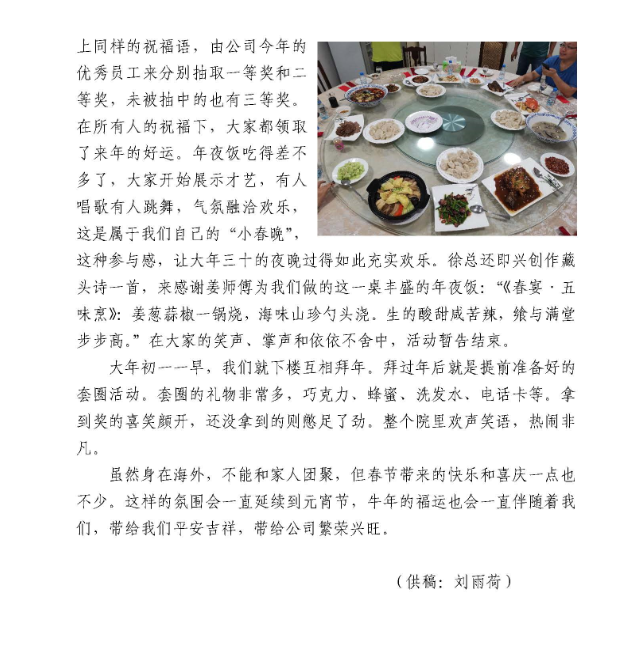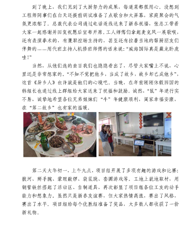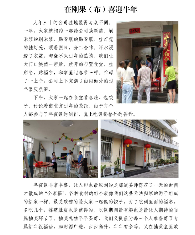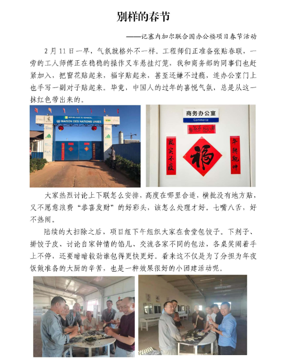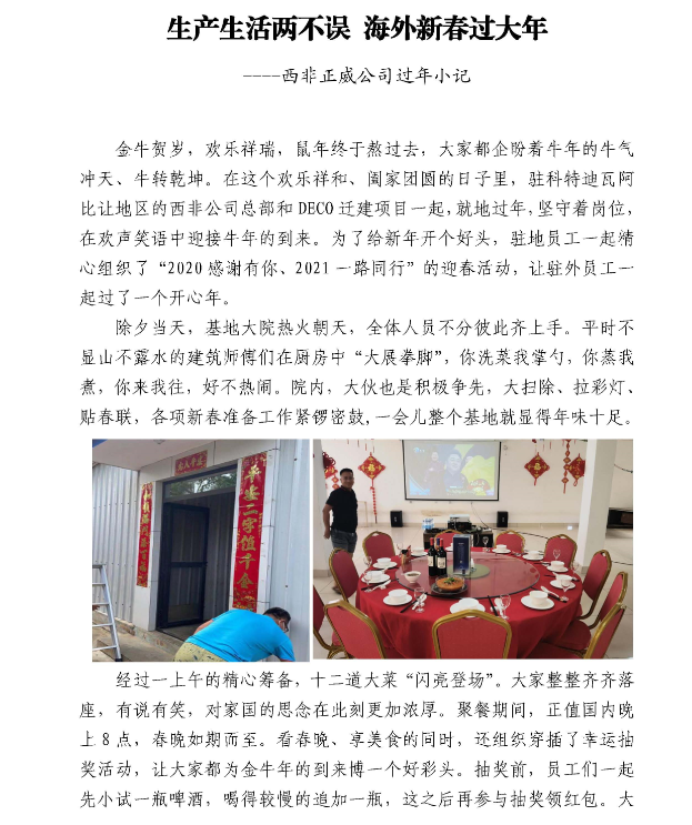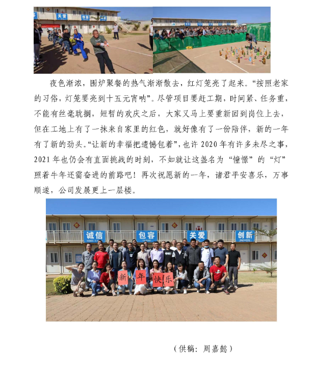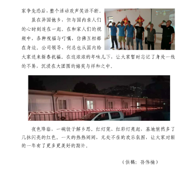 春節(jié)期間,公司駐外員工堅(jiān)守一線,30多個(gè)工程項(xiàng)目仍在有序推進(jìn),800多名建設(shè)者們把工地當(dāng)家,在異國(guó)它鄉(xiāng)的平凡崗位上書(shū)寫(xiě)不凡。當(dāng)然,在這個(gè)全球華人同喜共慶的歡樂(lè)時(shí)刻,大家也不忘貼對(duì)聯(lián)、掛燈籠、畫(huà)年畫(huà),聚在一起吃頓熱騰騰的年夜飯,其樂(lè)融融地觀看春晚。有的項(xiàng)目組還給大家準(zhǔn)備了新春禮物,有的舉辦了趣味盎然的慶?;顒?dòng)······。下面,就讓我們一起來(lái)感受一下他們的別樣“年味”。