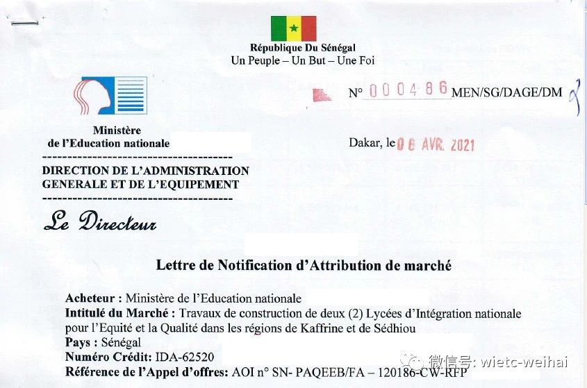 Recently, Société Zhengwei Technique Sénégal SARL (hereinafter referred to as Senegal Zhengwei) received the letter of acceptance from the Ministry of Education of Senegal notifying that Senegal Zhengwei won the bid for Sedhiou State High School Project. The project, located in Sedhiou Province in southern Senegal, is 385 km away from the capital city Dakar. The project consists of more than 20 single structures as well as outdoor engineering such as classrooms, student dormitories, a library, a dining hall, faculty dormitories, administrative buildings, etc., with a total building area of 16,800m2 and a contract value of more than US$ 10 million.