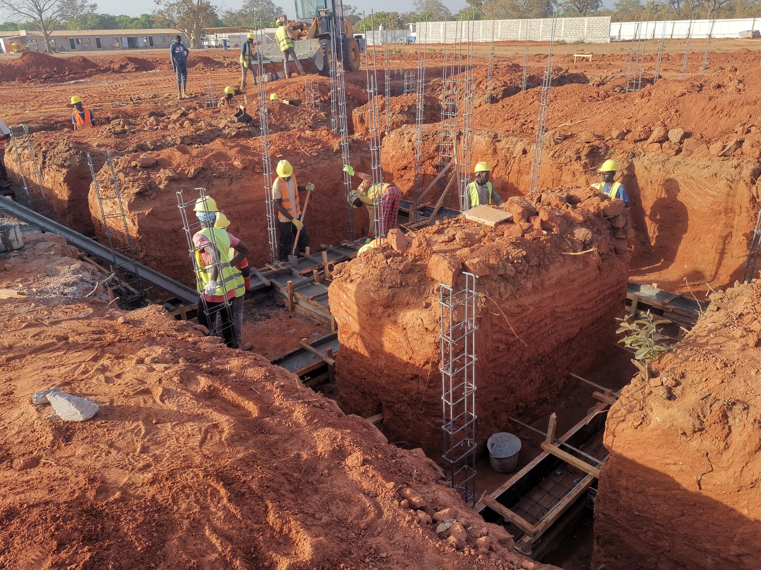 the foundation earthwork backfilling.                                               the concrete construction of the foundation beam.