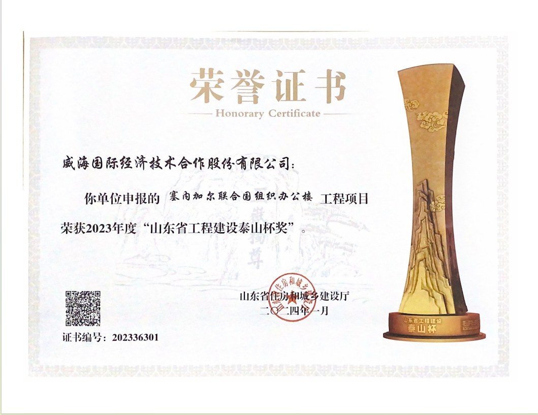 Le projet de batiment de bureau de l'Organisation des Nations Unies au Sénégal, construit par l'Entreprise en mode PPP, a remporté le ''Prix de la Coupe Taishan pour la construction des travaux de la province du Shandong'' en 2023. Récemment, la Direction provinciale du logement et de la construction urbaine et rurale du Shandong a délivré le certificat d'honneur. C'est la première fois que le projet des travaux à l'étranger de l'Entreprise remporte cet honneur, ce qui est gratifiant.