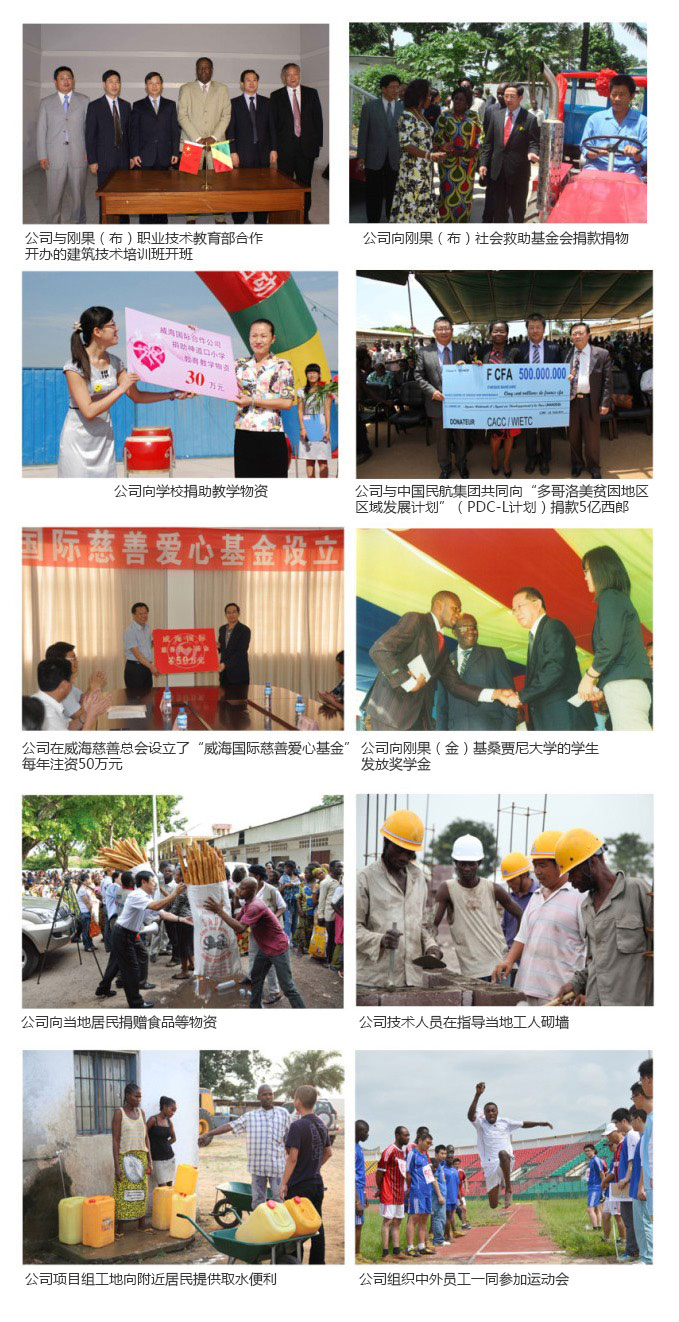 當(dāng)社は、各種の公益慈善活動(dòng)に積極に參加します。國(guó)內(nèi)において、當(dāng)社は、金と物品の寄付を行い、奨學(xué)金を設(shè)立し、且つ、寄付金で施設(shè)を建設(shè)する等の方式で長(zhǎng)期的に神道口小學(xué)と中學(xué)校、山東建築大學(xué)、威海小児福利院に資金援助を提供し、コミュニティの発展をサポートします;威海市慈善総會(huì)に「威海國(guó)際慈善基金」を設(shè)立し、毎年少なくとも50萬(wàn)人民元の寄付金を提供し、市慈善総のすべてのタイトルススポンサーシップ基金の中で一番大きです。國(guó)外において、各種類(lèi)の社會(huì)救済機(jī)構(gòu)、學(xué)校と國(guó)家運(yùn)動(dòng)チーム等に長(zhǎng)期的な資金援助を提供します;自然災(zāi)害又は社會(huì)危難が発生する時(shí)に、當(dāng)社は、最大な努力を盡くして救済に參加します;國(guó)外において施工力を利用して、地元の住居民の為に道路を修復(fù)し、水?電気の便利を提供し、政府の為に寄付金を提供してコミュニティ施設(shè)を建設(shè)する等。當(dāng)社の一つの項(xiàng)目の制度として、國(guó)外各屬領(lǐng)地にある會(huì)社は、毎年都地元の実際要求に適合する社會(huì)的責(zé)任履行計(jì)畫(huà)のリストを提出し、異なるテーマの配慮寄贈(zèng)活動(dòng)を確定します?,F(xiàn)在、當(dāng)社の慈善公益面の投入は、數(shù)千萬(wàn)人民元に達(dá)しました。