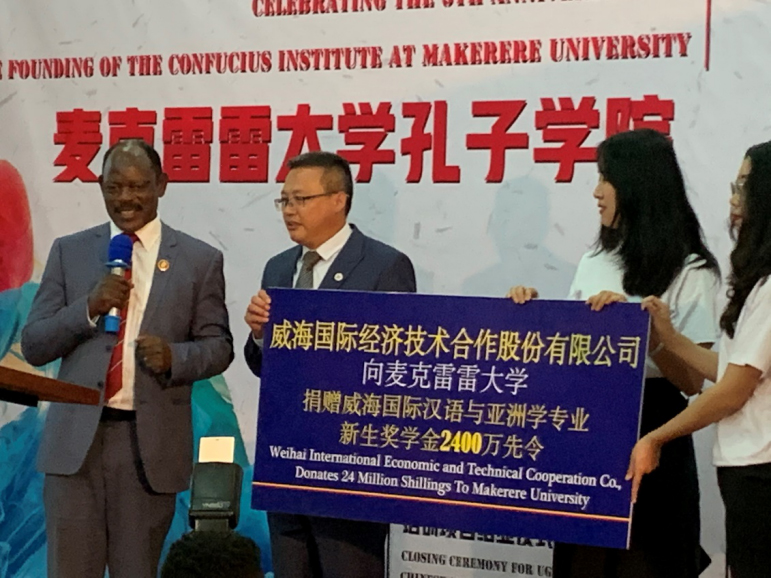 11月23日,為響應(yīng)威海國際公司2019年“筑夢未來—教育公益行動”的倡議,烏干達(dá)正威公司向烏干達(dá)麥克雷雷大學(xué)孔子學(xué)院捐贈獎學(xué)金2400萬先令,約合人民幣46000元,用以獎勵15名漢語與亞洲學(xué)專業(yè)的新生。